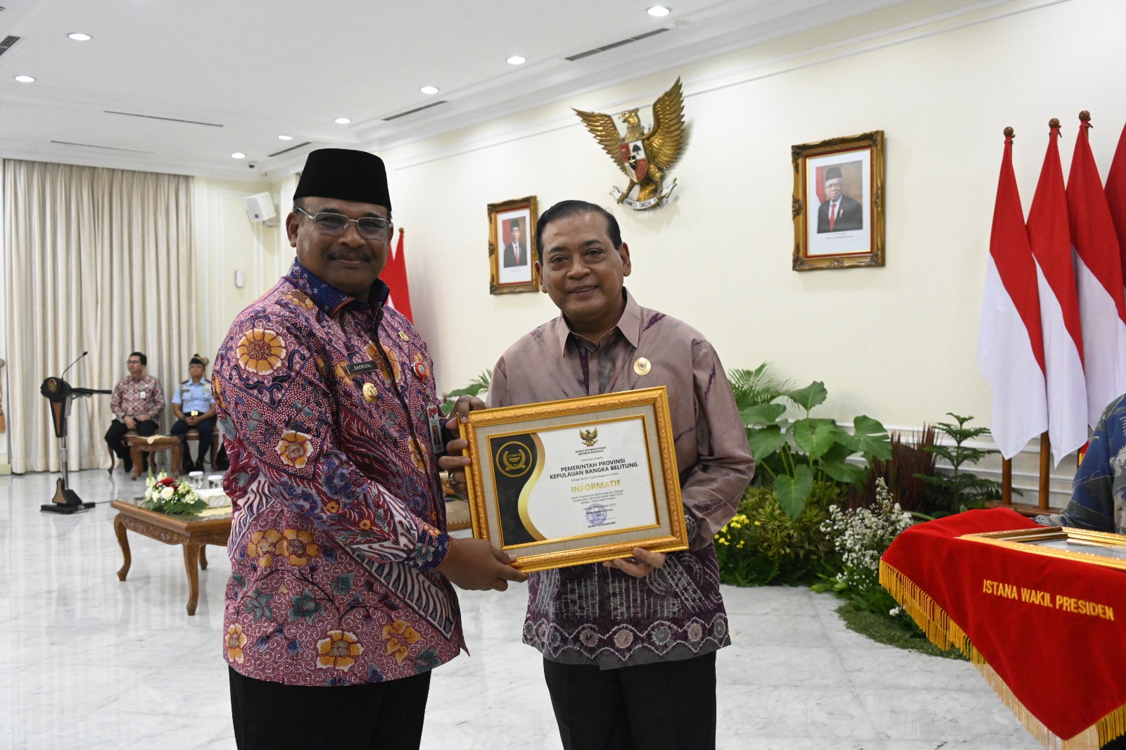 Menempati posisi ke-9, Pemprov Kep. Babel memperoleh nilai sebesar 93,60 sebagai badan publik informatif. Penghargaan tersebut diterima langsung oleh Penjabat (Pj) Gubernur Kep. Babel Safrizal ZA yang didampingi Kadiskominfo Kep. Babel Sudarman, di Istana Wakil Presiden, Selasa (19/12/23).